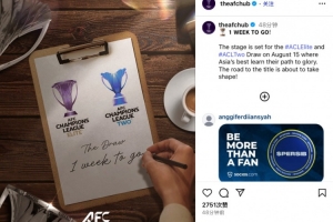 亚足联官媒配文写道:“距离抽签仪式还有一周!亚冠精英联赛和二级联赛抽签将在8月15日举行,舞台已经准备好了,通往冠军之路即将成行!”